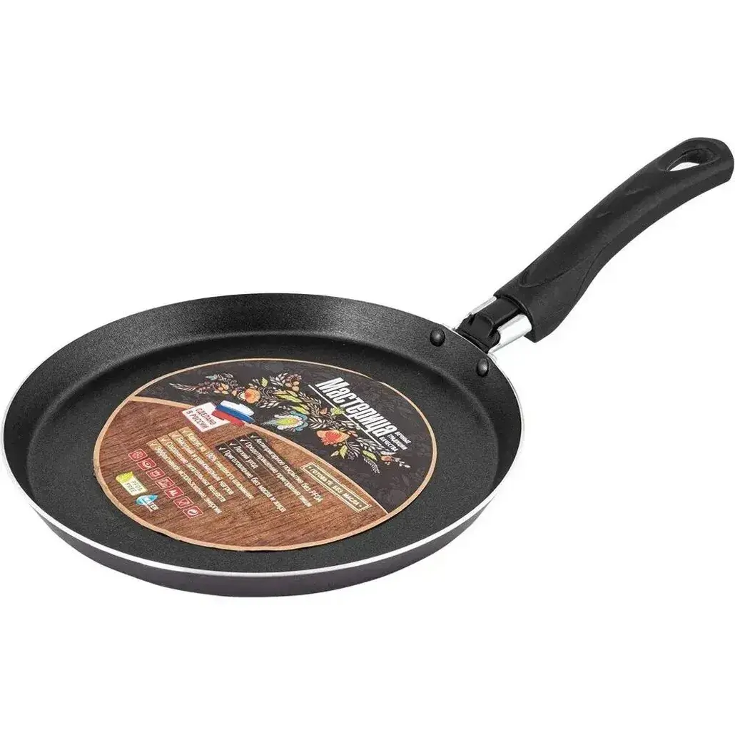 Антипригарное покрытие гарантирует равномерный нагрев и легкое отхождение блинов без пригорания. Эргономичная ручка с отверстием для подвешивания обеспечивает безопасность и удобство хранения.