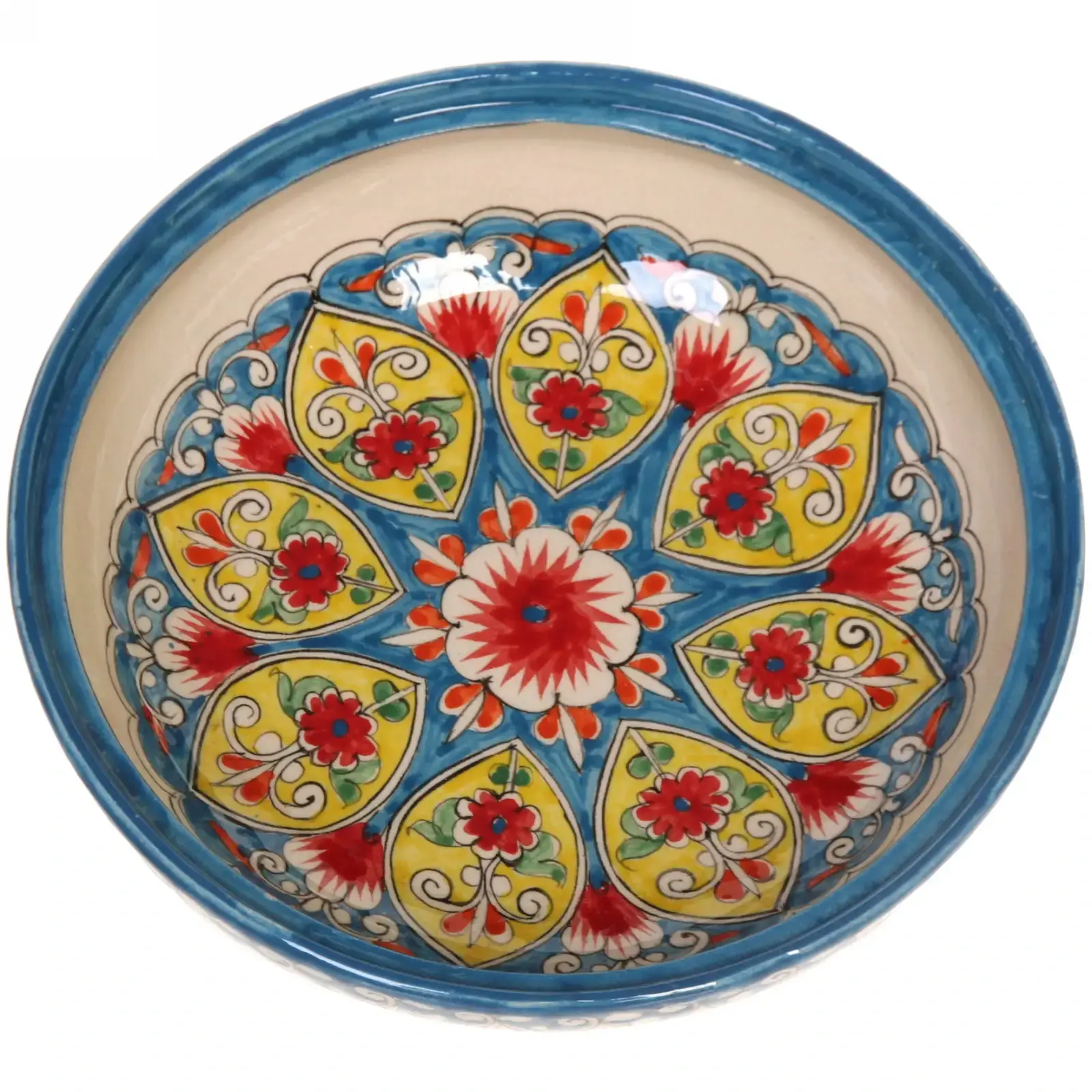 Керамическая блинница с крышкой — это гармония аутентичного дизайна и современной практичности. Яркая ручная роспись в технике «риштанской» керамики превращает обычную посуду в произведение искусства для вашей кухни.