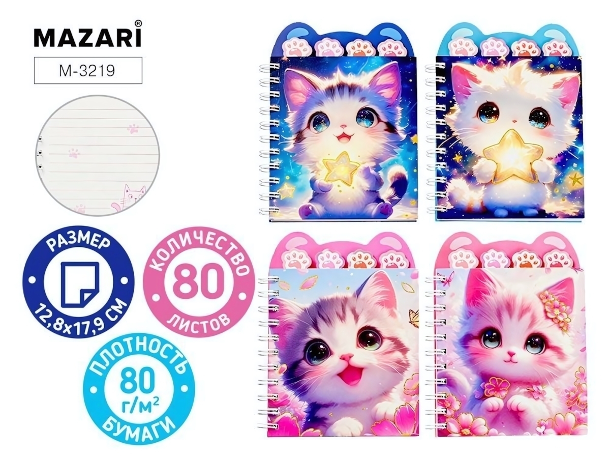 Блокнот с котиками на евроспирали, 12,8х17,9 см, 80 листов, линейка, разделители, плотность 80г/м², 4 дизайна