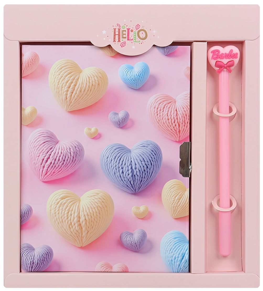 Стильный блокнот с замком и ручкой станет уютным пространством для мыслей, идей и важных заметок. Нежный розовый дизайн с объемными сердцами создает особое настроение и делает каждую запись по-настоящему личной. Металлический замочек с ключиками помогает сохранить содержимое в тайне, что особенно важно для дневников и творческих записей.