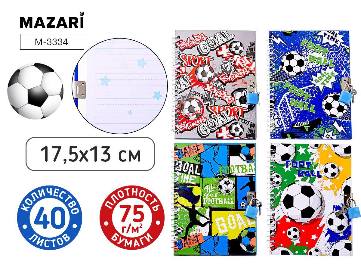 Блокнот 17.5*13см. 45л. линия "Футбол" с замочком, плотность бумаги 75 г/м2, 4 дизайна (Mazari)