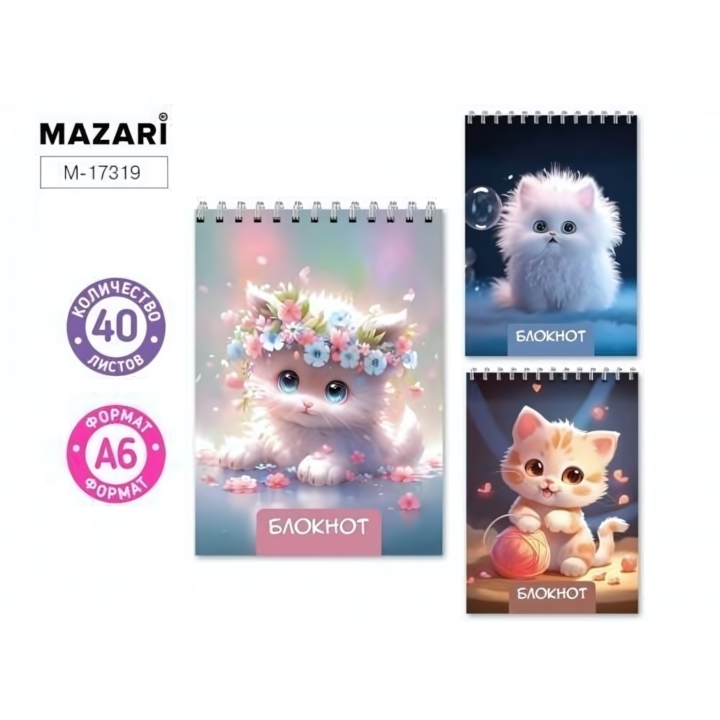 Блокнот А6 40л на спирали «Котята», 3 дизайна, обложка картон, клетка — Mazari