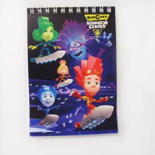 Картонная обложка украшена качественной печатью с изображением Фиксиков на серфинг-досках. Размер блокнота соответствует стандартному формату А6, что делает его удобным для повседневного использования. Спиральное крепление позволяет легко переворачивать страницы и надежно удерживает их в одном блоке.