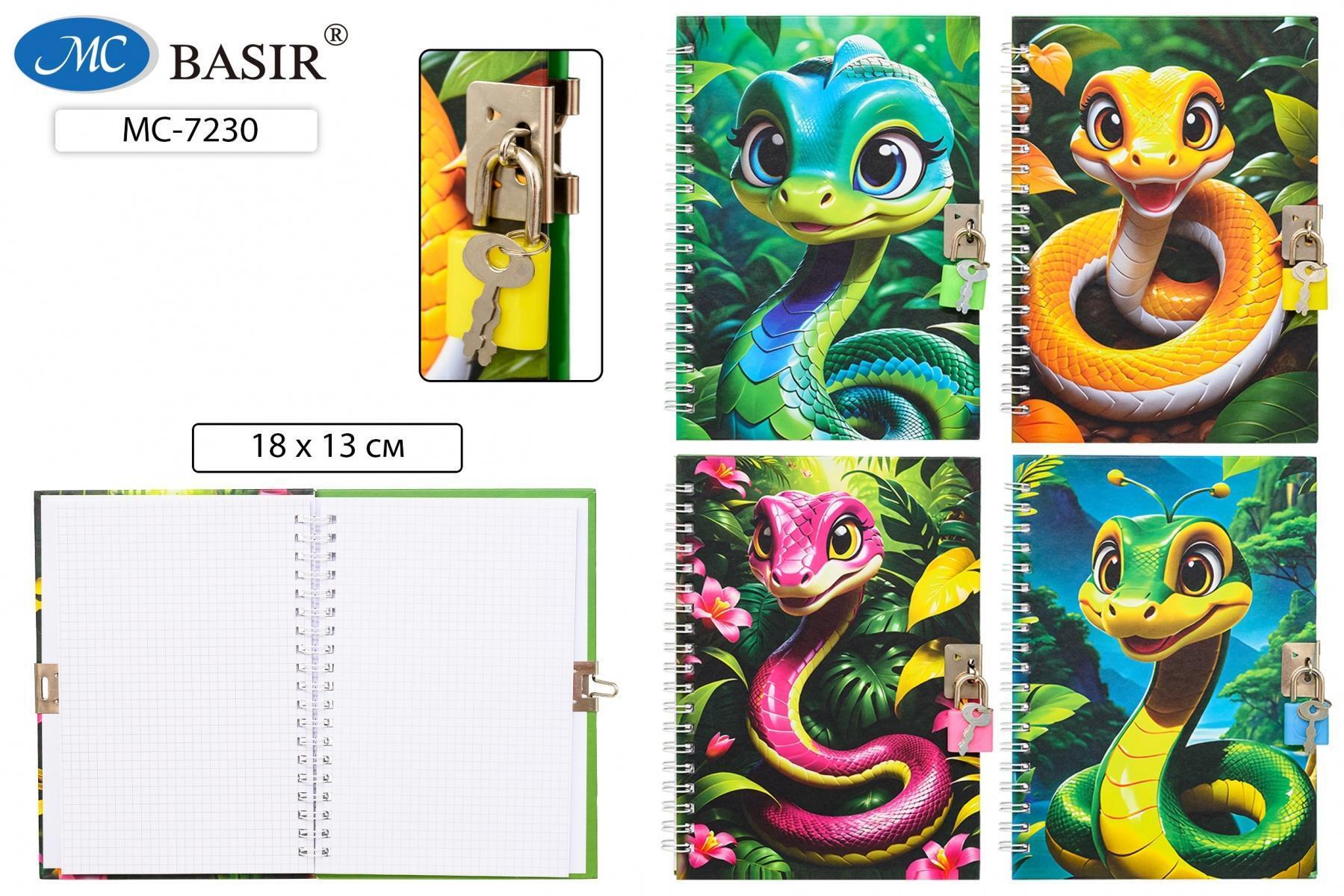 Блокнот детский 'Змея' 18х13см, 48л клетка, с замочком, яркий ассорти