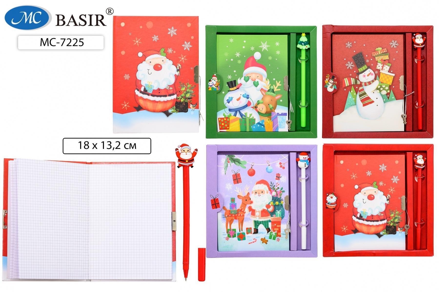 Дополнительные детали: размеры 21х20,5 см, 48 листов, блок-клетка внутри, обложка из плотного цветного картона, комплект включает ручку с наконечником и декоративные элементы с изображениями новогодних персонажей.