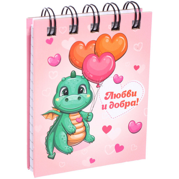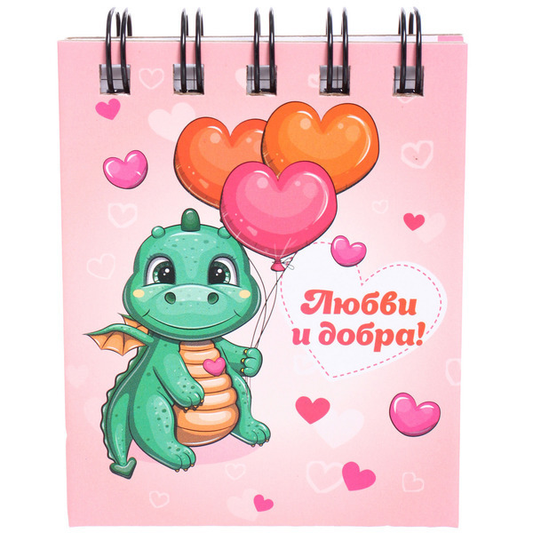Блокнот «Малыш Дино» выделяется своим ярким дизайном с изображением мультяшного дракона, который держит воздушные шары. Розовая обложка с сердечками и текстом «Любви и добра!» создает позитивное настроение и вдохновляет на творчество. Металлические кольца переплета обеспечивают надежность и долговечность, а мелкая клетка на страницах помогает аккуратно записывать мысли и идеи.