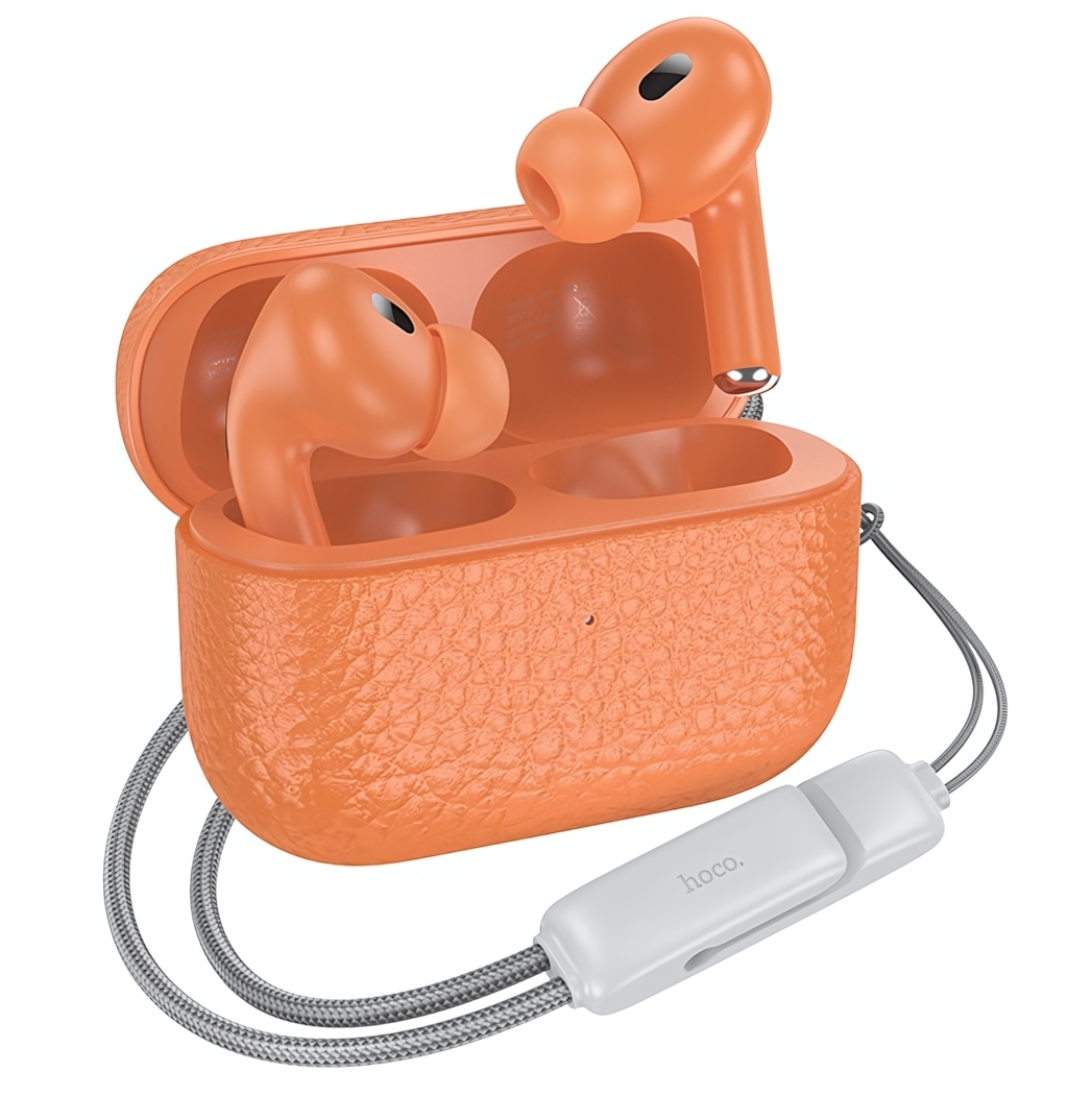 Наушники имеют компактный зарядный кейс, который удобно носить с собой. Кейс выполнен в оранжевом цвете с текстурированной поверхностью, что придаёт ему стильный вид. Внутри кейса предусмотрены углубления для надежного хранения наушников. С HOCO EQ9 вы получите не только качественный звук, но и стильный аксессуар, который подчеркнёт вашу индивидуальность.