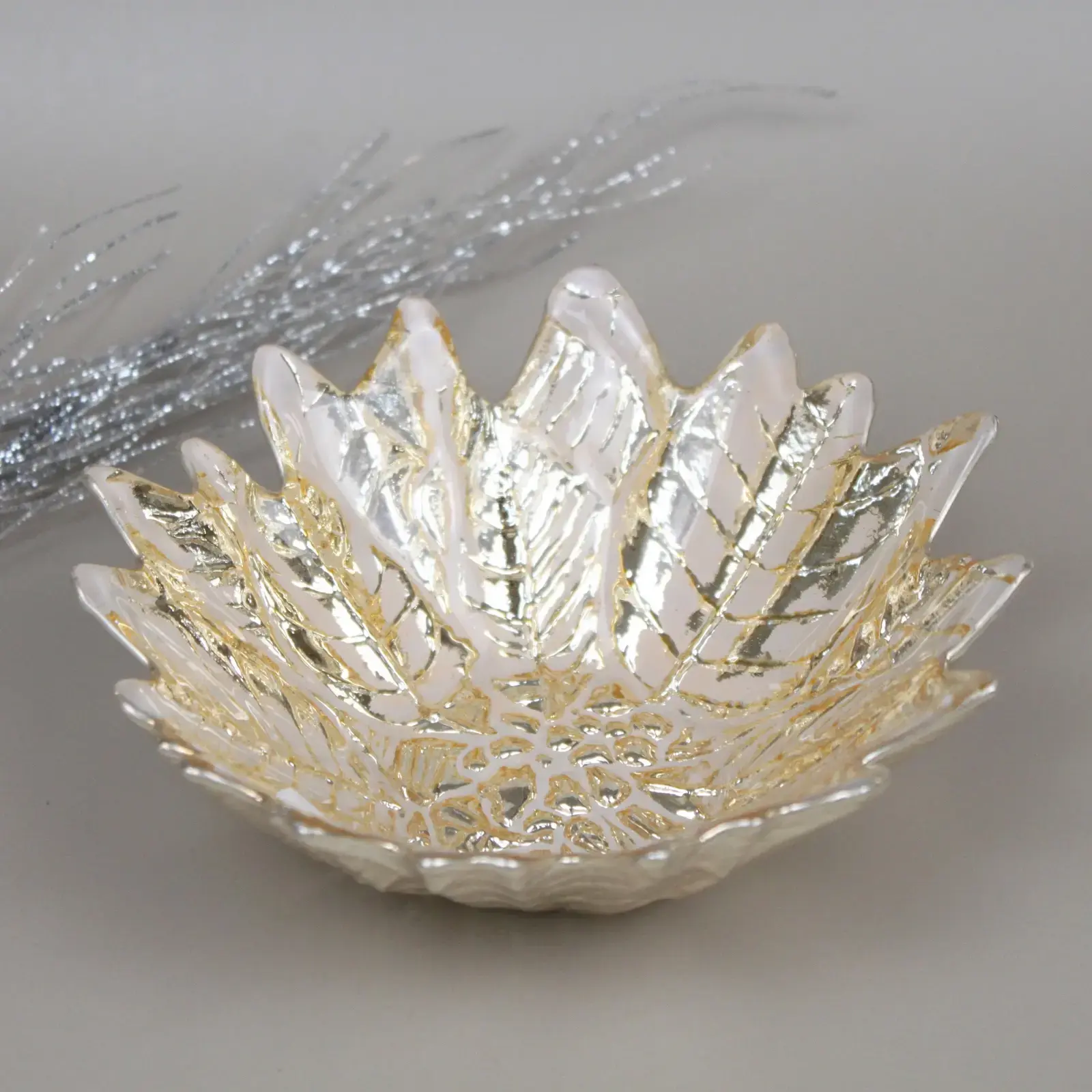 Это изысканное блюдо станет настоящим украшением вашего стола и добавит нотку утонченности в любой интерьер. Его уникальный дизайн в форме цветка с золотыми акцентами создает атмосферу праздника и уюта. Блюдо идеально подходит для сервировки закусок, десертов или как элемент декора.