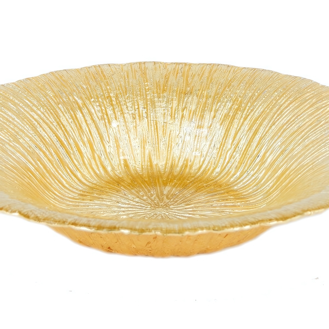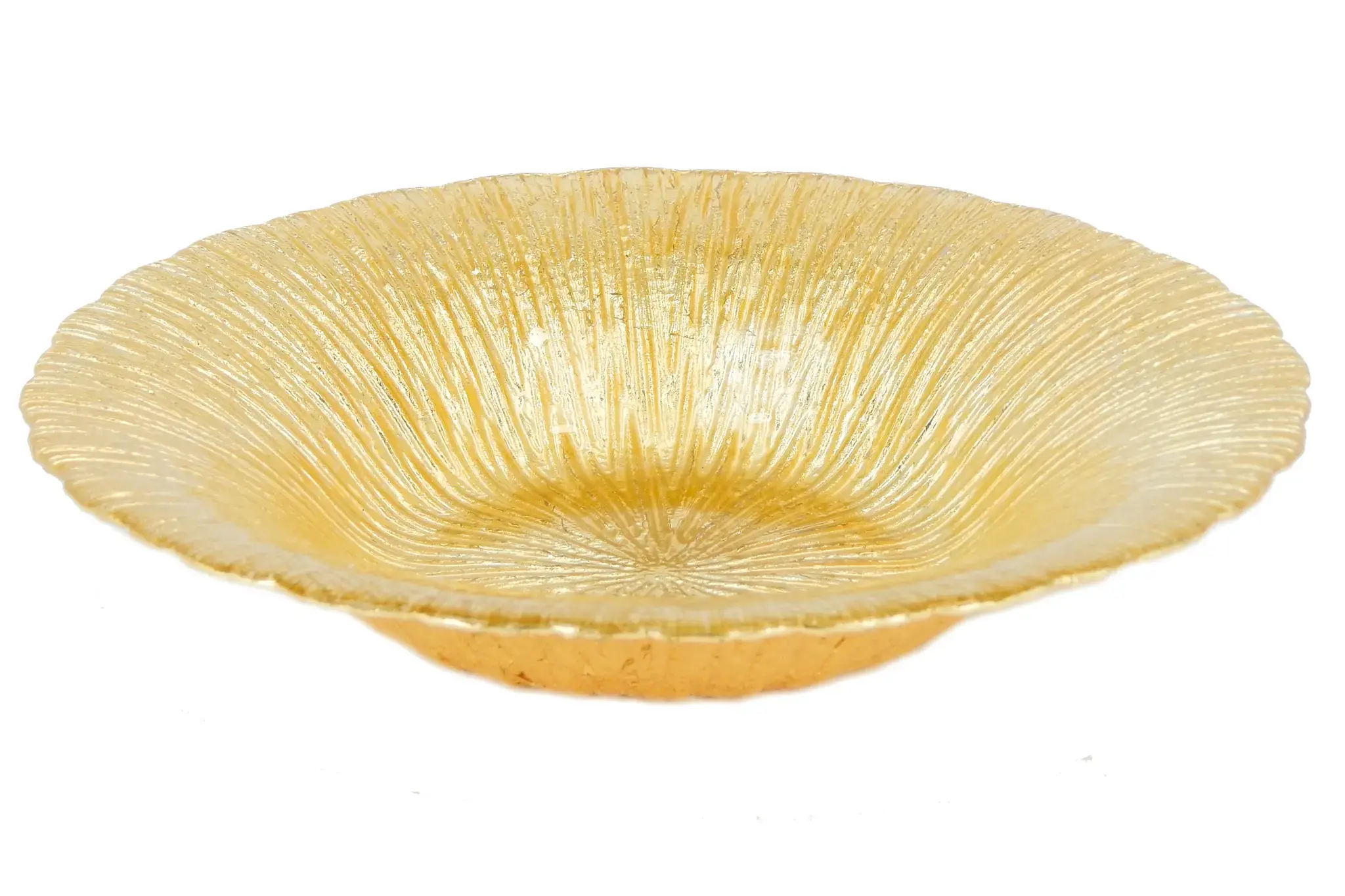 Диаметр блюда составляет 30 см, что делает его идеальным для подачи закусок, салатов или десертов. Золотистый цвет и рифленая текстура придают ему особую привлекательность. Блюдо станет отличным подарком для ценителей красивой посуды и уникальных предметов интерьера.