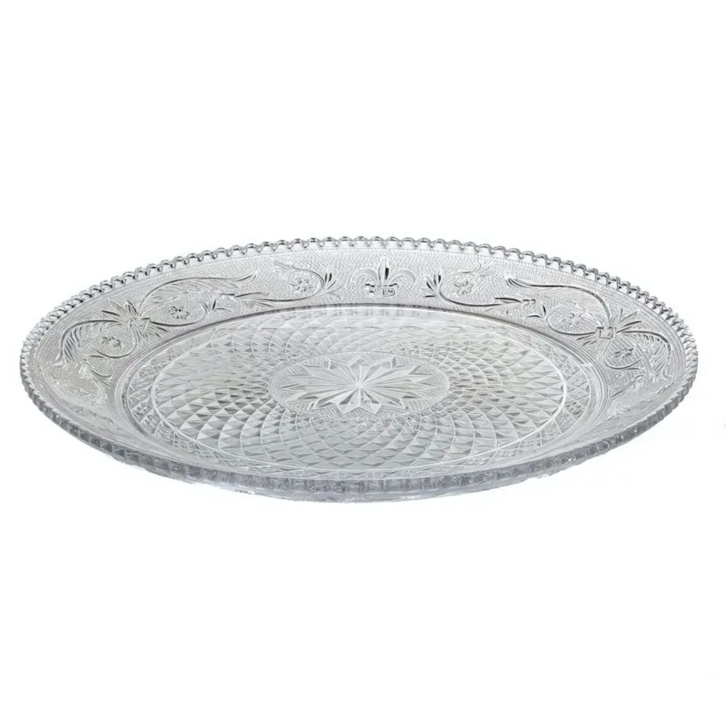 Размер блюда составляет 35,4 см, что делает его универсальным для различных типов сервировки. Прозрачный цвет позволяет легко сочетать его с другими элементами посуды, а рельефный узор добавляет интересный акцент. Блюдо изготовлено из качественного стекла, что обеспечивает его легкость и простоту в уходе.
