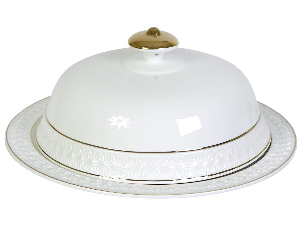 Рельефный узор по краю блюда и в нижней части крышки гармонично сочетается с тонкими золотистыми линиями, подчёркивая утончённый стиль сервировки. Такое блюдо органично смотрится как на повседневном столе, так и во время семейных праздников и чаепитий.