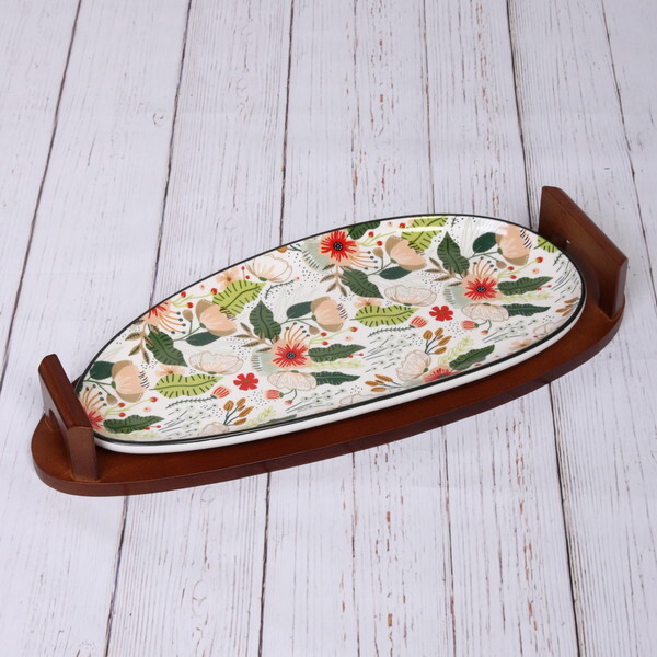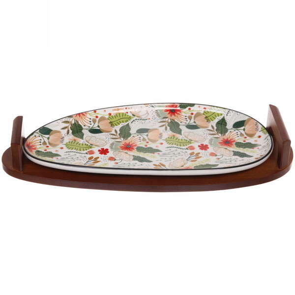 Блюдо имеет овальную форму и размер 35.5 см, что делает его универсальным для подачи различных закусок, салатов или десертов. Деревянная подставка обеспечивает удобство при переноске и добавляет натуральный акцент в оформление. Это блюдо станет отличным выбором для семейных ужинов, встреч с друзьями или торжеств.