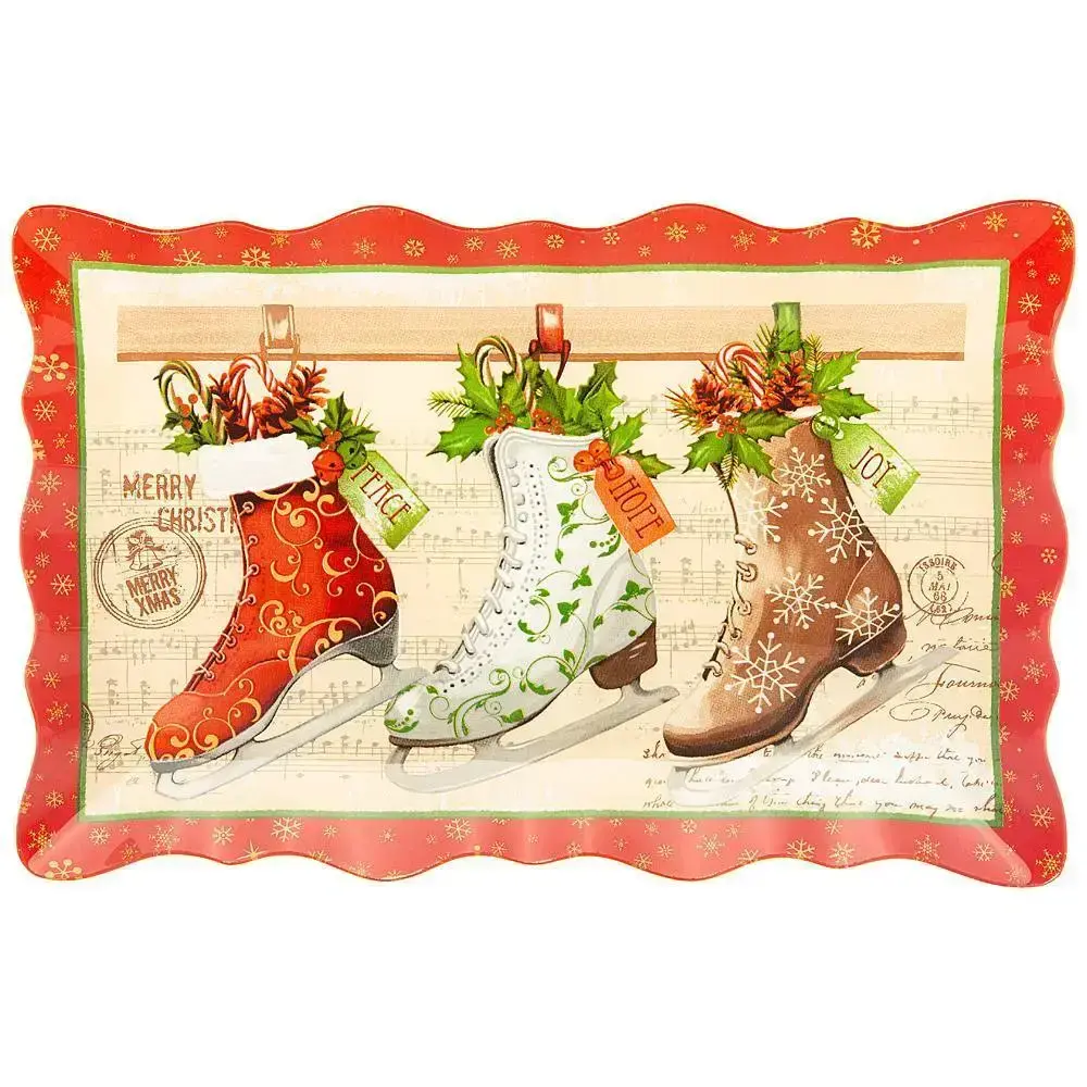 Материал – стекло. Размеры – 25×16,5 см. Благодаря качеству исполнения и износостойкости блюдо будет радовать взгляд не один сезон. Его оригинальный рисунок с фигурными рождественскими коньками и праздничными надписями делает изделие особенно эффектным. Подойдёт в качестве подарка любителям красивой сервировки или как элемент новогоднего декора.