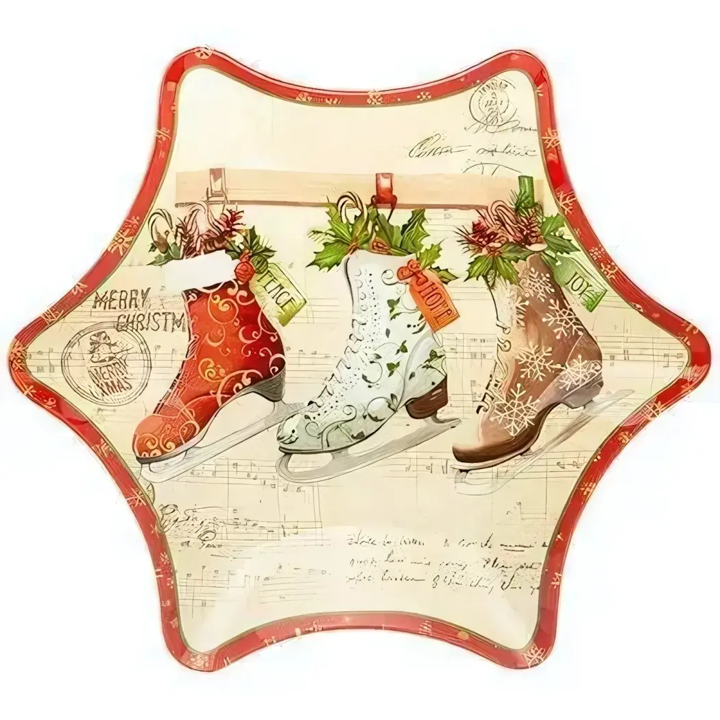 Создайте атмосферу уюта и праздника на вашем столе с элегантным блюдом «Рождественская сказка» в форме звезды. Яркий дизайн с праздничными мотивами и теплыми зимними цветами мгновенно привлекает внимание и задаёт настроение торжества. Это блюдо станет прекрасным элементом сервировки, подчеркнув ваш вкус и любовь к деталям.