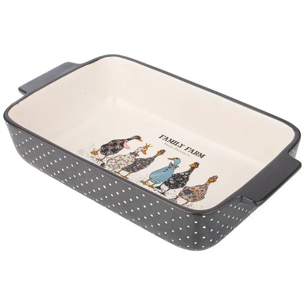 Прямоугольная форма оптимальна для запекания мяса, рыбы и овощей, а также эффектной сервировки. Уникальный дизайн с росписью гусей и надписью FAMILY FARM создаёт уютную атмосферу фермерского дома.