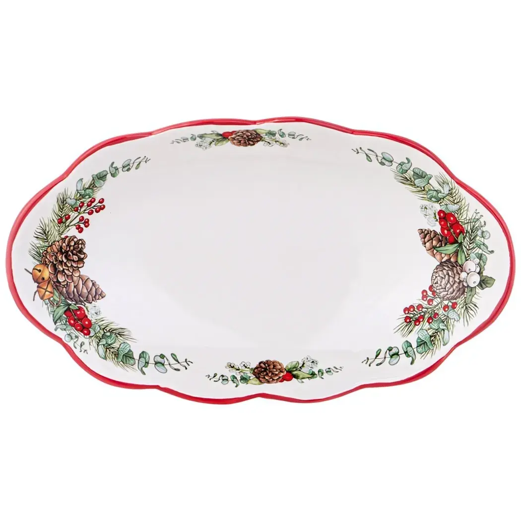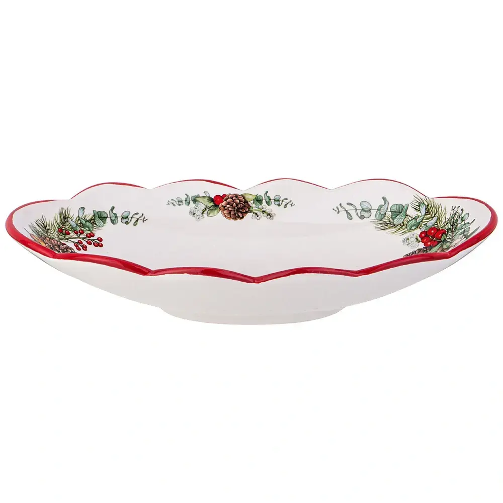 Блюдо упаковано в красочную коробку, что делает его готовым к подарку. Декоративный рисунок включает элементы новогодней тематики, такие как шишки и ягоды, что создает праздничное настроение. Обратите внимание, что изделие не предназначено для использования в микроволновой печи.
