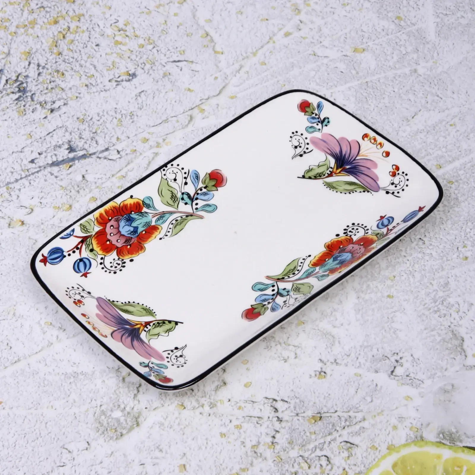 Блюдо выполнено из высококачественной керамики, что гарантирует его долговечность. Черная окантовка по краю добавляет изысканности и завершенности дизайну. Размеры блюда позволяют использовать его для различных целей, а яркие цветочные узоры делают его центром внимания на любом столе.