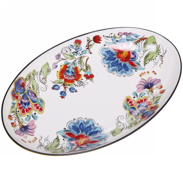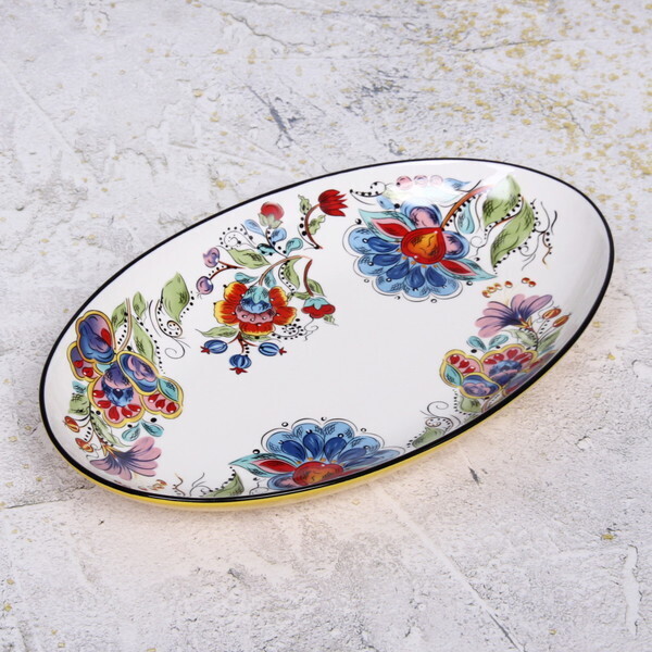 Размеры блюда составляют 33 см в длину, 20 см в ширину и 4 см в высоту. Яркий цветочный узор и черная окантовка придают ему стильный вид, а качественная керамика гарантирует долговечность. Это блюдо станет не только функциональным, но и эстетически привлекательным элементом вашего дома.