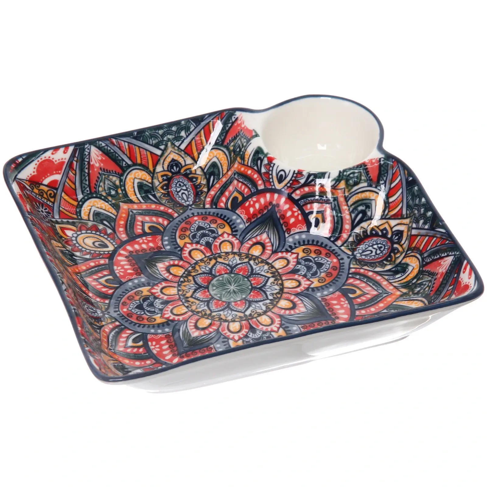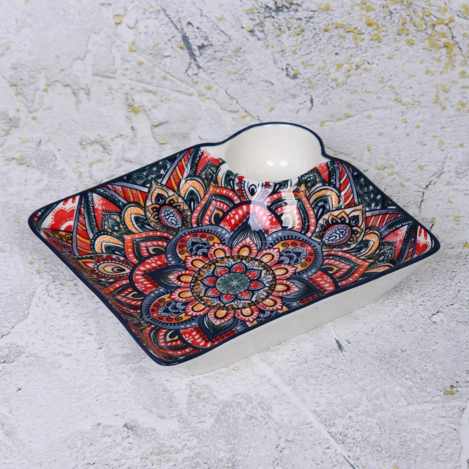 Погрузитесь в атмосферу восточного уюта с керамическим блюдом «Марракеш». Это блюдо не только украсит ваш стол, но и станет практичным помощником в сервировке. Яркие цвета и уникальный дизайн делают его идеальным для подачи закусок, десертов или гарниров. Благодаря углублению в центре, вы сможете удобно разместить соусы или приправы, что добавит удобства в процессе подачи блюд.