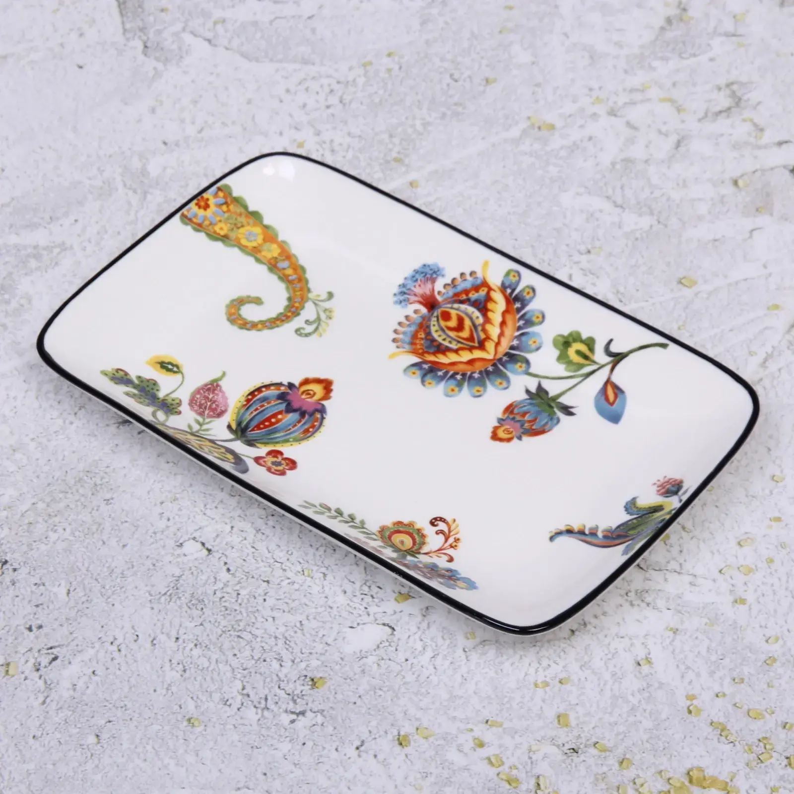 Блюдо выполнено из качественной керамики, что гарантирует его долговечность и легкость в уходе. Оно имеет белый фон с ярким цветочным узором, который включает красные, синие, зеленые и желтые оттенки. Черная окантовка по краям добавляет изысканности и завершенности. Это блюдо станет отличным подарком для ваших близких или прекрасным дополнением к вашей кухонной коллекции.