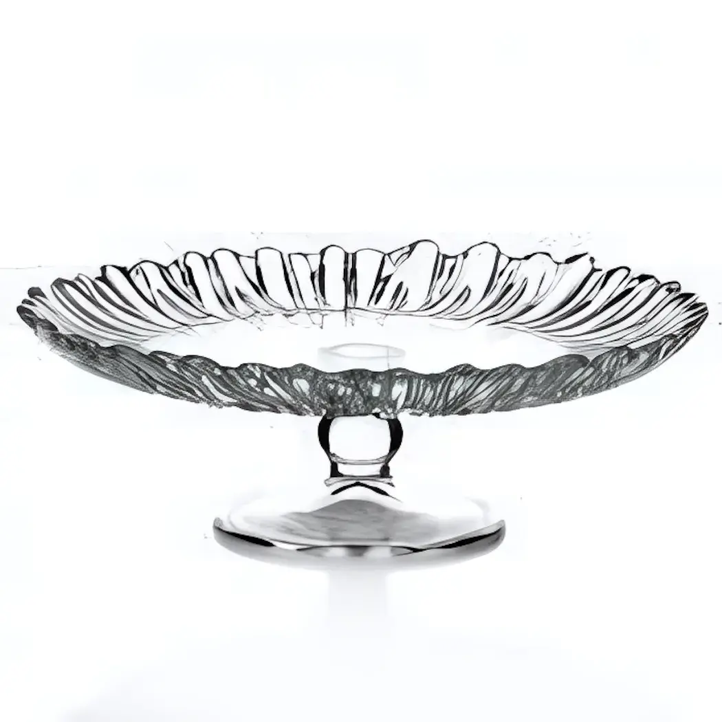 Стеклянное блюдо «Аврора» с изящной ножкой станет украшением праздничного стола и повседневной сервировки. Волнистый край и рельефные узоры создают эффект игры света, превращая обычную подачу в дизайнерскую композицию.