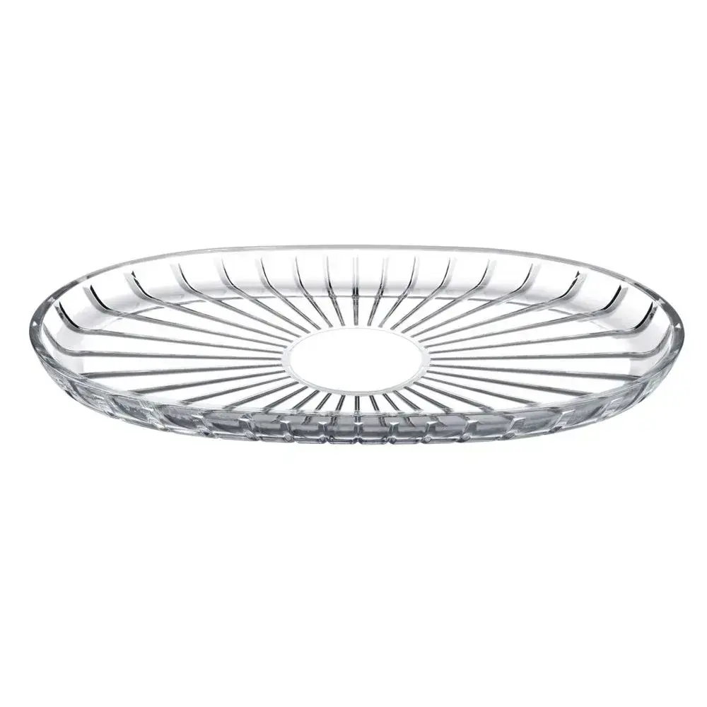 Стеклянное блюдо с металлическим декором сочетает практичность и изысканный стиль. Идеально подходит для презентации закусок, десертов и фруктов на праздничных мероприятиях и семейных ужинах.