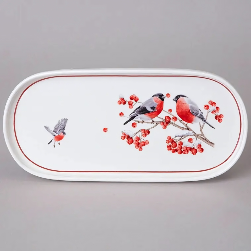 Элегантное фарфоровое блюдо длиной 25,5 см с зимним рисунком станет выразительным элементом сервировки и создаст атмосферу уюта. Белоснежная поверхность, тонкая красная окантовка и живописный сюжет с птицами на ветвях с красными ягодами органично дополнят праздничный стол и подчеркнут ваш вкус.