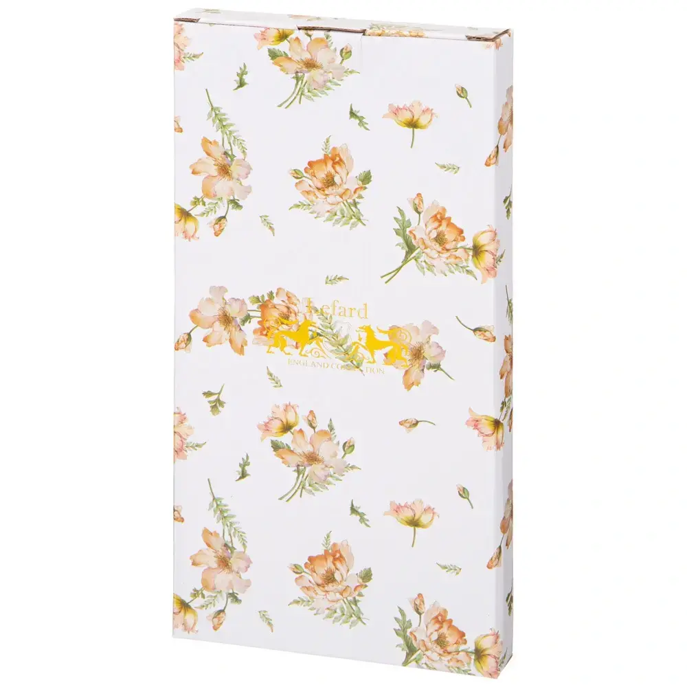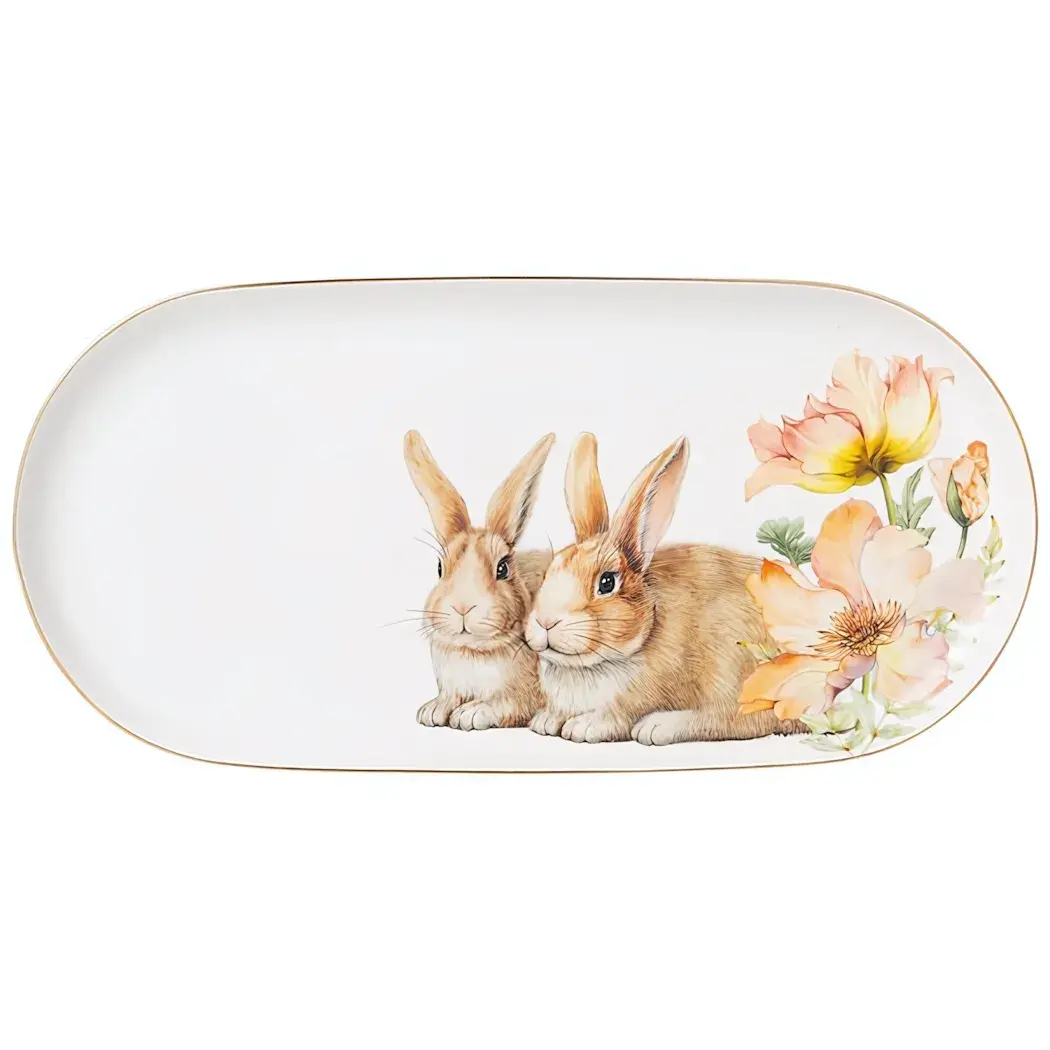 Размер блюда составляет 30,5 см, что делает его достаточно вместительным для подачи различных блюд. Белый цвет с золотистой окантовкой придает ему изысканный вид, а реалистичные изображения кроликов и цветов добавляют нотку игривости. Упаковано блюдо в красочную коробку, что делает его отличным вариантом для подарка.
