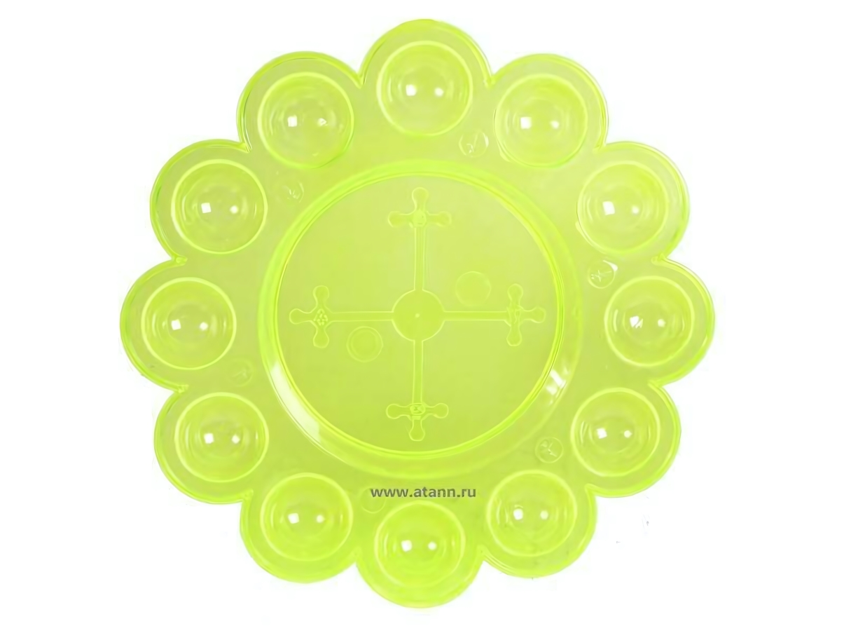 Это блюдо, выполненное из прочного, полупрозрачного светло-зеленого пластика, привлекает внимание своим оригинальным дизайном. Оно имеет удобное центральное отделение и внешний зубчатый край, разделенный на 15 сегментов. Такая структура позволяет аккуратно разместить множество мелких угощений, сохраняя порядок на столе. В центре блюда изящно нанесено изображение креста, символизирующее светлый праздник.