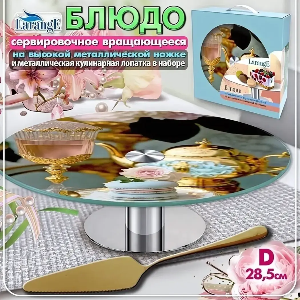 Преобразите свои застолья с помощью этого стильного вращающегося блюда, которое станет настоящим украшением вашего стола. Блюдо диаметром 28,5 см выполнено из высококачественного стекла и установлено на прочной металлической ножке, что обеспечивает надежность и долговечность. С золотой кулинарной лопаткой в комплекте, вы сможете легко сервировать любимые блюда и угощения, радуя своих гостей.