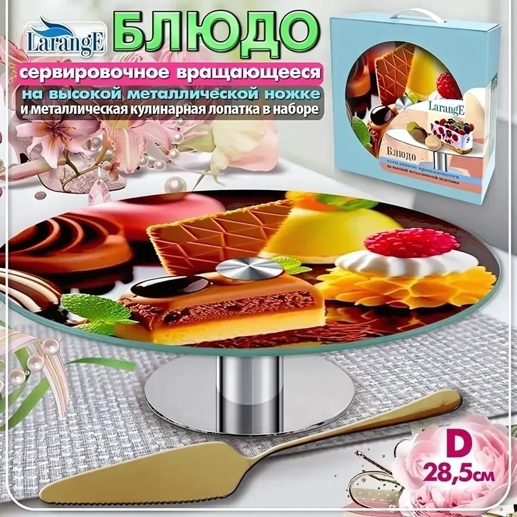 Вращающееся блюдо с декоративным рисунком станет изюминкой вашего стола. Идеально для презентации десертов, канапе или фруктовых нарезок — гости смогут рассмотреть угощения со всех сторон без лишних движений.