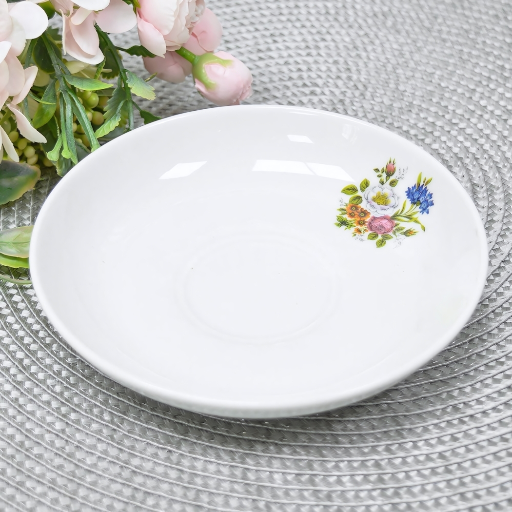Размеры блюда: 150 мм в диаметре. Материал: фарфор. Цвет: белый с цветочным узором, включающим розовые, желтые и синие цветы. Это блюдце станет не только функциональным, но и эстетически приятным элементом вашей посуды.