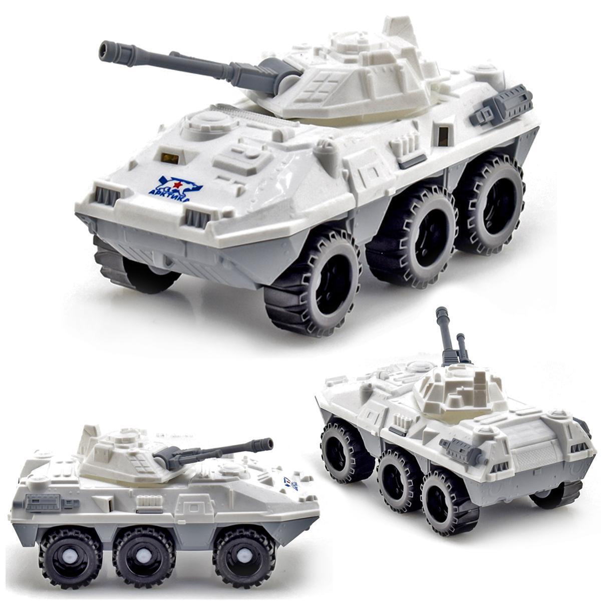 Бронетранспортер выполнен в белом цвете с серыми и черными элементами, что придает ему стильный и современный вид. На корпусе присутствуют различные детали конструкции, включая имитацию орудия на крыше, что добавляет реалистичности. Игрушка станет отличным подарком для маленьких любителей военной техники и поможет развить их интерес к технике и истории.