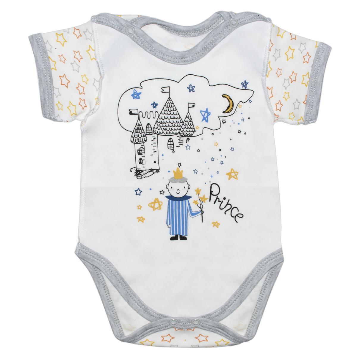 Боди представлено в зеленом цвете с яркими элементами, такими как замок, звезды и персонаж с короной. Оно имеет короткие рукава и подходит для теплой погоды. Размер 62 идеально подходит для малышей, обеспечивая комфорт и стиль в одном флаконе.