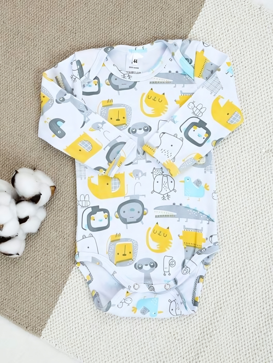 Длинные рукава с манжетами защитят от сквозняков, а двойной ряд кнопок на ластовице обеспечивает быструю смену подгузника. Специально разработанная посадка не сковывает движения, позволяя малышу свободно двигать ручками и ножками.
