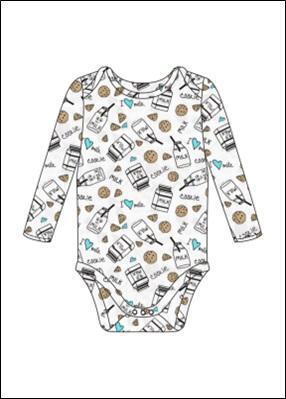 Боди украшено стильным принтом в пастельных тонах с изображениями банок, пирожных и сердечек. Такой дизайн понравится и мальчикам, и девочкам.