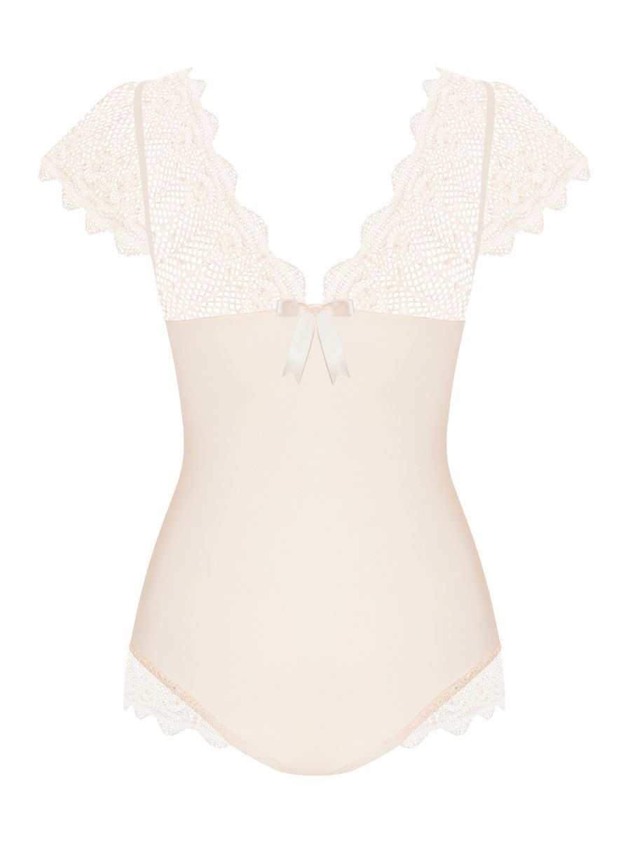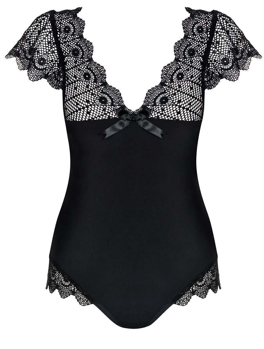 V-образный вырез и короткие рукава с кружевной отделкой создают соблазнительный силуэт. Плотная ткань основной части гарантирует необходимую поддержку, тогда как ажурные вставки добавляют воздушности образу. Особенность конструкции — регулируемые бретели для персонализации посадки.