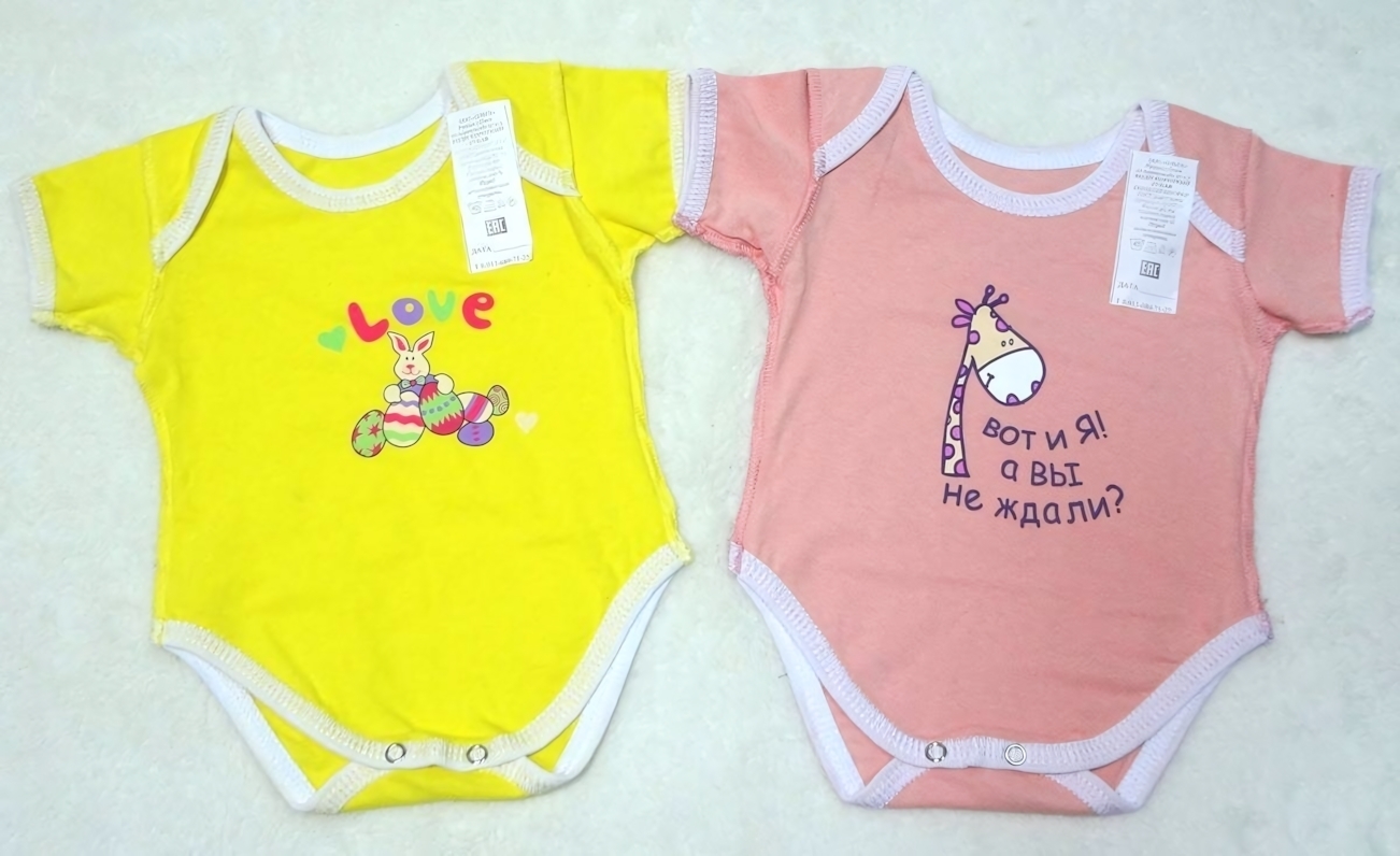 Размер 68 подходит для малышей 6-9 месяцев. В ассортименте представлены модели с милыми принтами: желтое боди с зайчиком и надписью Love, розовый вариант с жирафом и игривой фразой. Белоснежная окантовка горловины и рукавов добавляет стильный акцент.