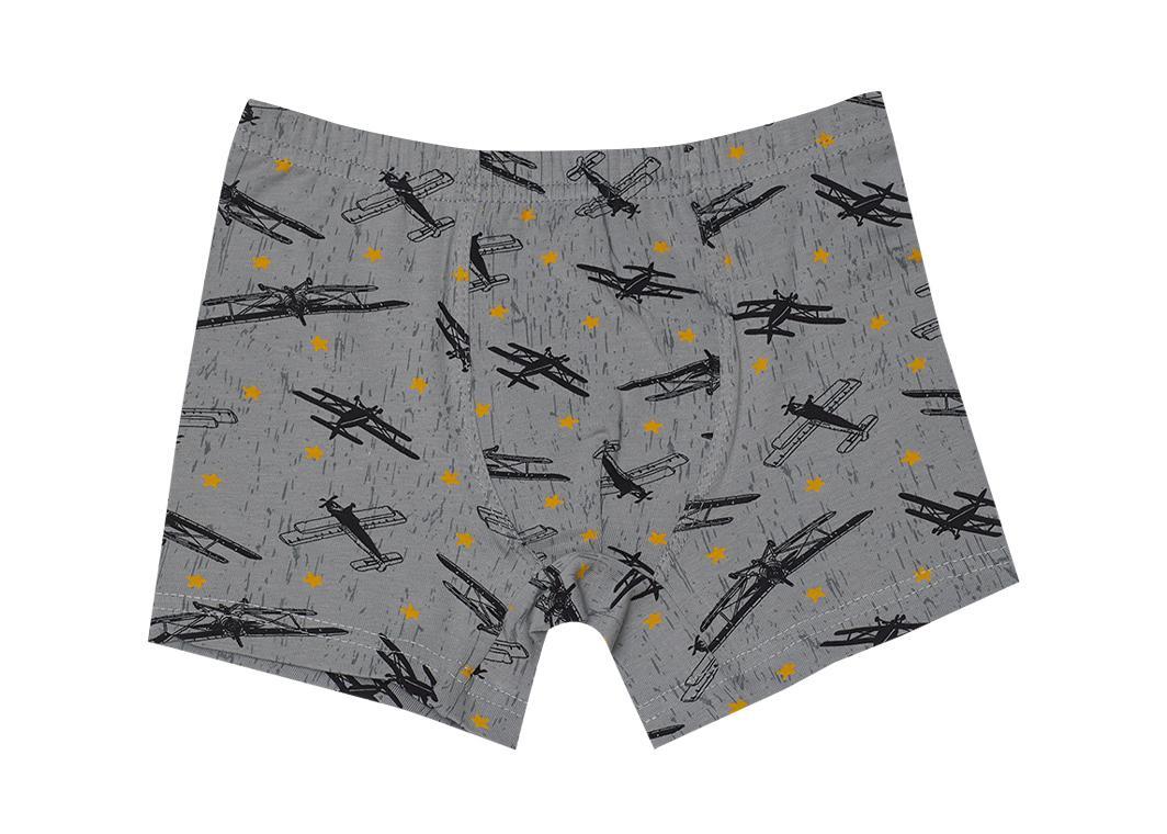 Принт с изображением самолетов и звездочек придется по душе маленьким любителям авиации. Нейтральная цветовая гамма (серый с черными и желтыми элементами) позволяет легко комбинировать белье с другой одеждой.
