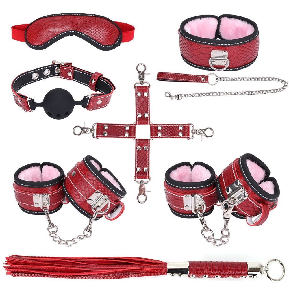 В набор входят: наручники, оковы, ошейник с цепочкой-поводком, фиксатор, плеть, кляп и маска. Все элементы выполнены из высококачественного поливинилхлорида (ПВХ), который имитирует текстуру кожи рептилий, что добавляет изысканности и стиля. Мягкая внутренняя подкладка предотвращает натирание кожи, обеспечивая комфорт даже при длительном использовании.