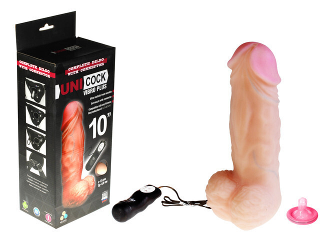 Вибратор для страпон-трусиков UNICOCK 10'', 12 режимов, Neoskin (вторая кожа), 24,3 см, телесный