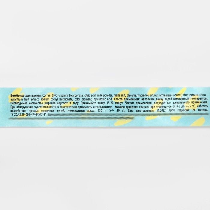 Объем бомбочки составляет 130 г, что делает её идеальной для одного использования. Состав включает в себя такие компоненты, как sodium bicarbonate, citric acid, milk powder, maris salt и другие натуральные ингредиенты. Храните бомбочку в сухом месте при температуре от +5 до +25 °C, бережно защищая от прямых солнечных лучей. Срок годности составляет 24 месяца с даты изготовления.