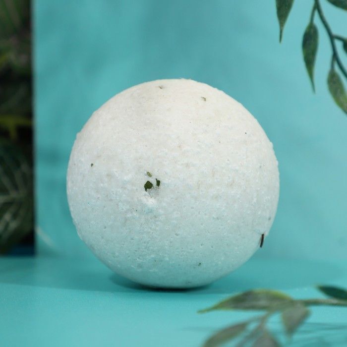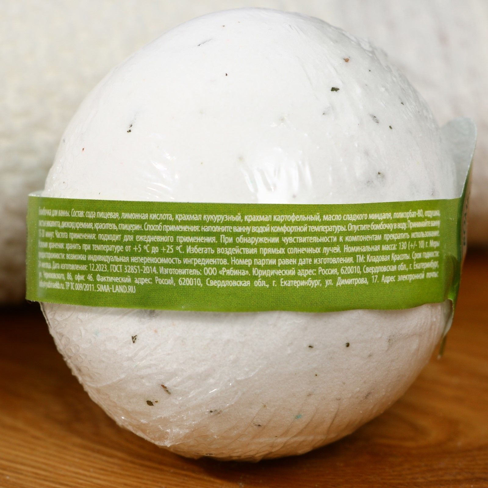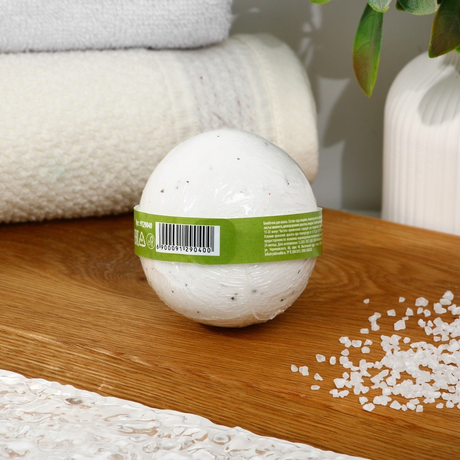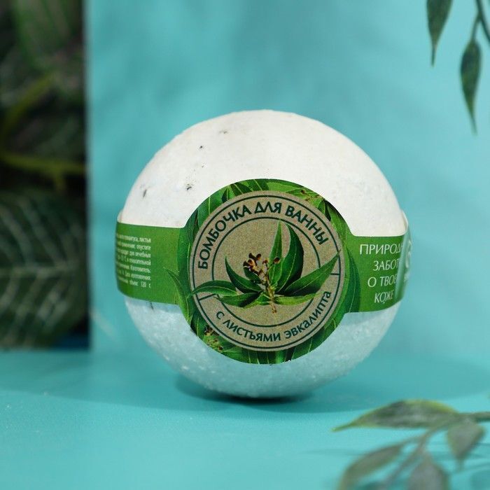 Объем бомбочки составляет 120 гр, а ее диаметр — около 7-8 см. Она имеет белый цвет с небольшими черными и зелеными вкраплениями, что делает ее не только полезной, но и эстетически привлекательной. Упаковка оформлена в виде полосы с зелёным фоном и изображением листьев эвкалипта, что подчеркивает натуральность продукта.
