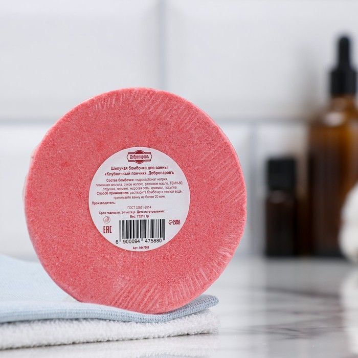 Объем бомбочки составляет 75 гр, что идеально подходит для одной ванны. Цвет бомбочки — розовый, с декоративными элементами в виде сердечек, что делает её не только полезной, но и красивой. Продукт произведен в России под брендом 'Добропаровъ', что гарантирует высокое качество и безопасность.