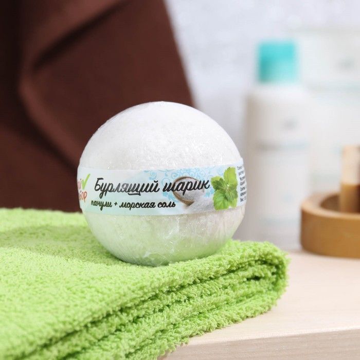 Бомбочка имеет округлую форму и гладкую поверхность, что делает её удобной в использовании. Она весит 140 грамм и изготовлена в России. Состав включает соль каменная, бикарбонат натрия, лимонную кислоту и эфирное масло пачули. Срок годности составляет 3 года, что позволяет вам наслаждаться ею долгое время.