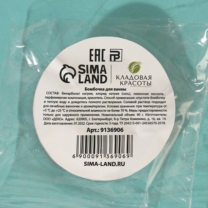 Объем бомбочки составляет 40 г, что делает её компактной и удобной для хранения. Она имеет округлую форму и размер около 5 см в диаметре, что позволяет легко держать её в руке. Храните бомбочку в сухом месте при температуре от +5 °C до +25 °C, вдали от источников влаги, чтобы сохранить её свойства на долгое время.