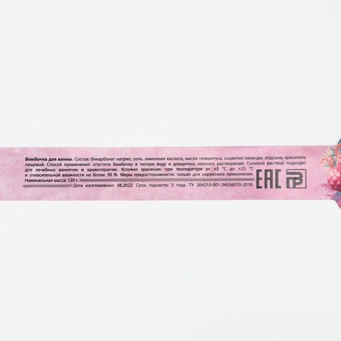 - Состав: бикарбонат натрия, соль, лимонная кислота, масло геллантуса, соцветия лаванды, краситель пищевой
