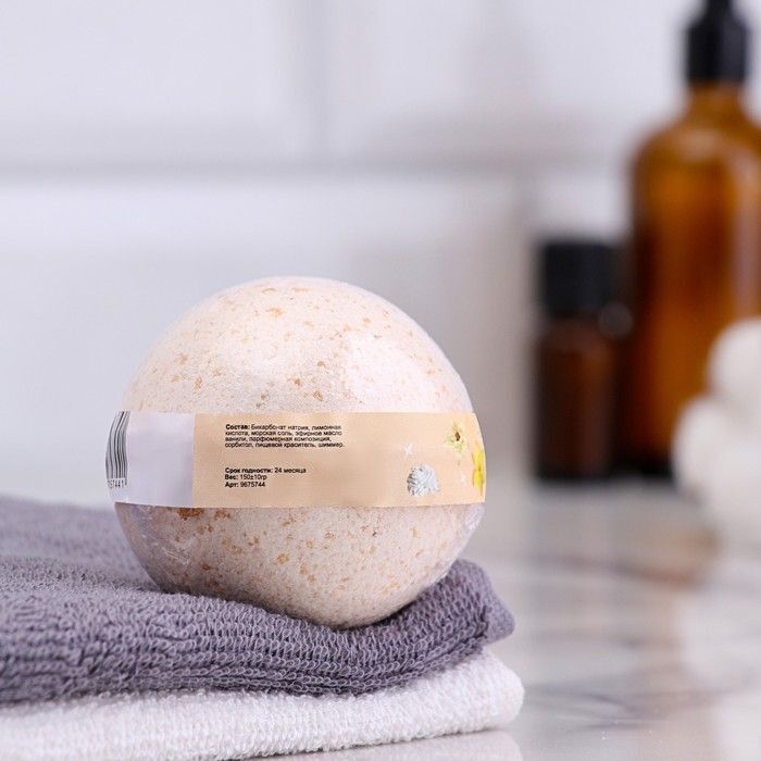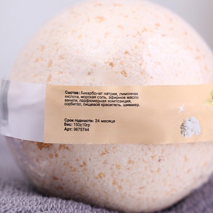 Вес бомбочки составляет 150 г, что делает её идеальной для одной ванны. Состав включает бикарбонат натрия, лимонную кислоту, морскую соль и эфирное масло ванили, что обеспечивает не только приятный аромат, но и полезные свойства для кожи. Бомбочка имеет пористую текстуру, что способствует её быстрому растворению в воде.