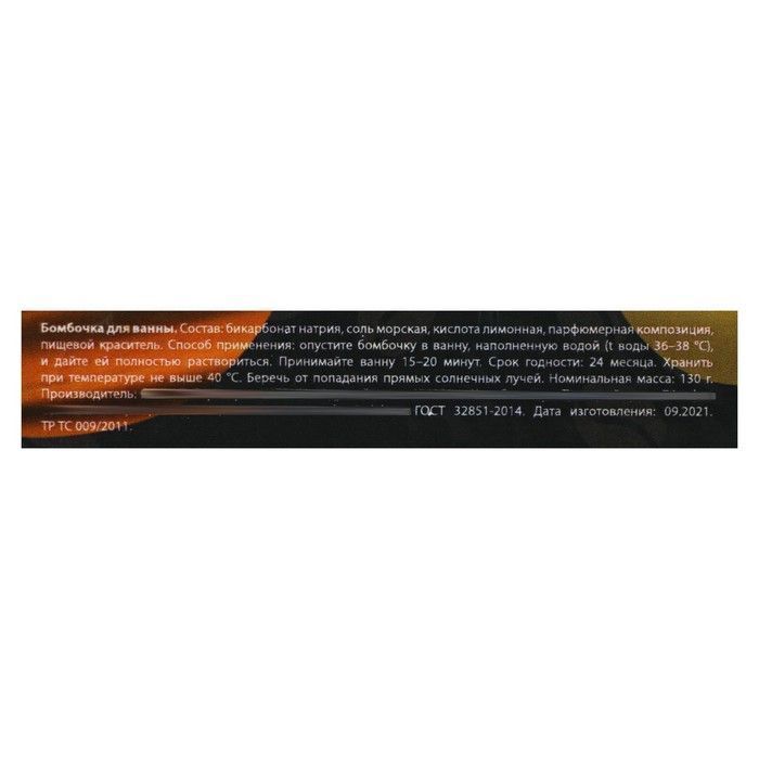 Вес бомбочки составляет 130 г, что делает её удобной для использования. Упаковка выполнена в стильном черном и золотистом дизайне, что добавляет эстетики вашему уходу за собой. Храните бомбочку в темном месте и бережно относитесь к ней, чтобы она сохранила свои свойства на протяжении 24 месяцев.