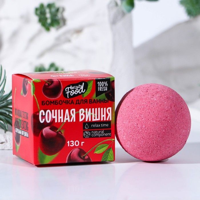Бомбочка имеет округлую форму и розовый цвет с текстурированной поверхностью. Упаковка выполнена в ярком красном цвете с изображением вишен, что делает её отличным подарком для близких. Не забывайте хранить бомбочку в сухом месте при температуре от +5 до +25 градусов Цельсия, избегая солнечных лучей.